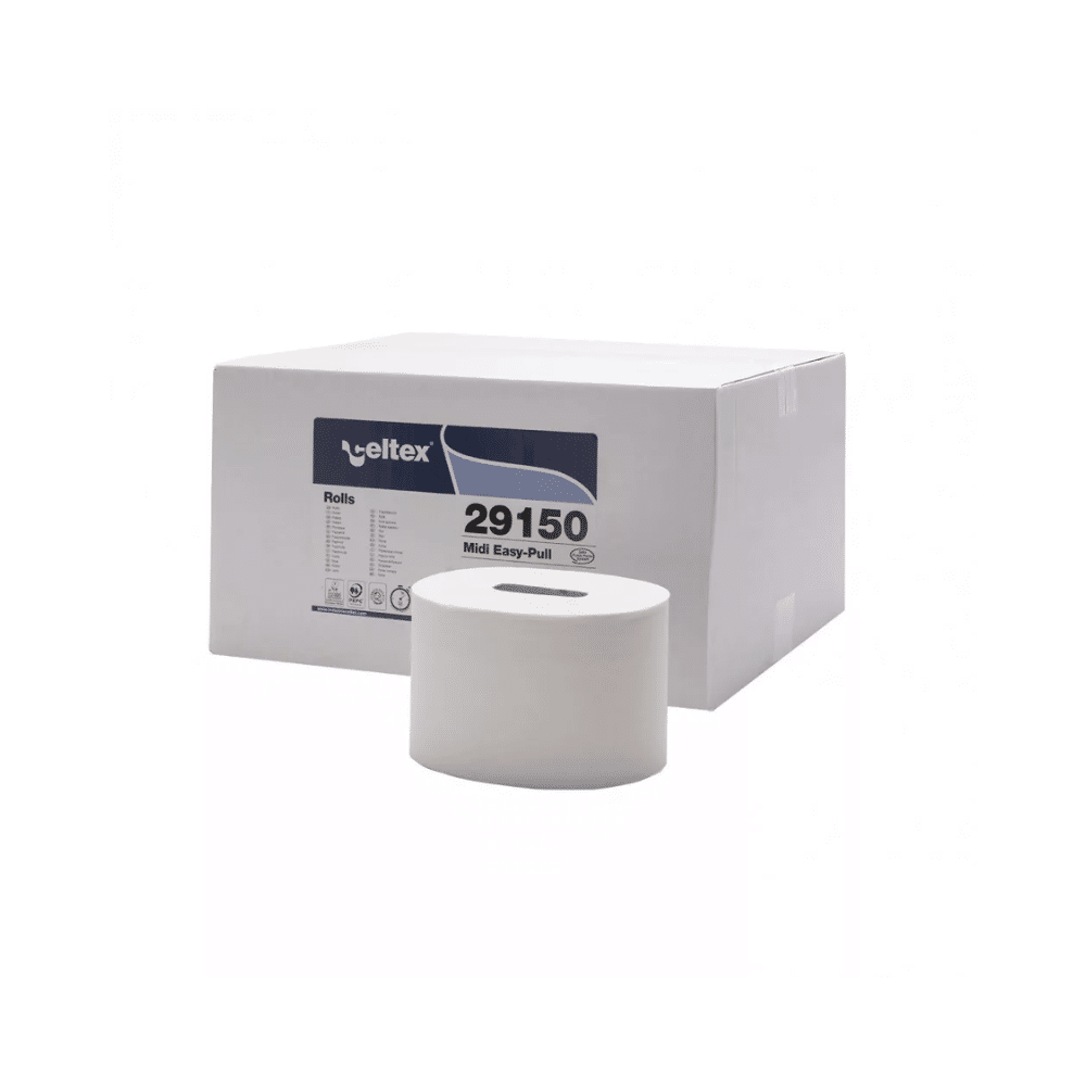 A Celtex midi belsőmagos toalettpapír 2 rétegű 100% cell, fehér, 150m/tekercs 12 tekercs/karton egy professzionális, közületi használatra tervezett termék, amely kimagaslóan gazdaságos és praktikus megoldást kínál a nagy forgalmú helyszínek számára.