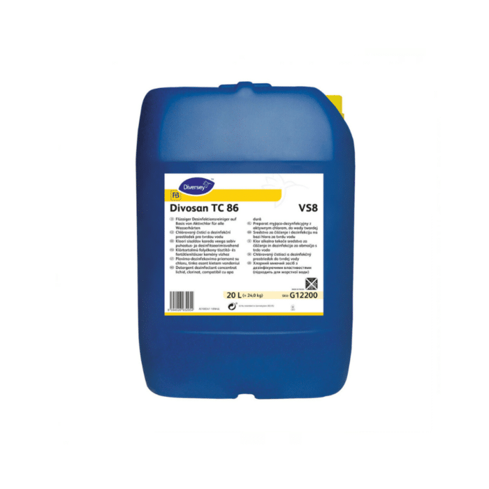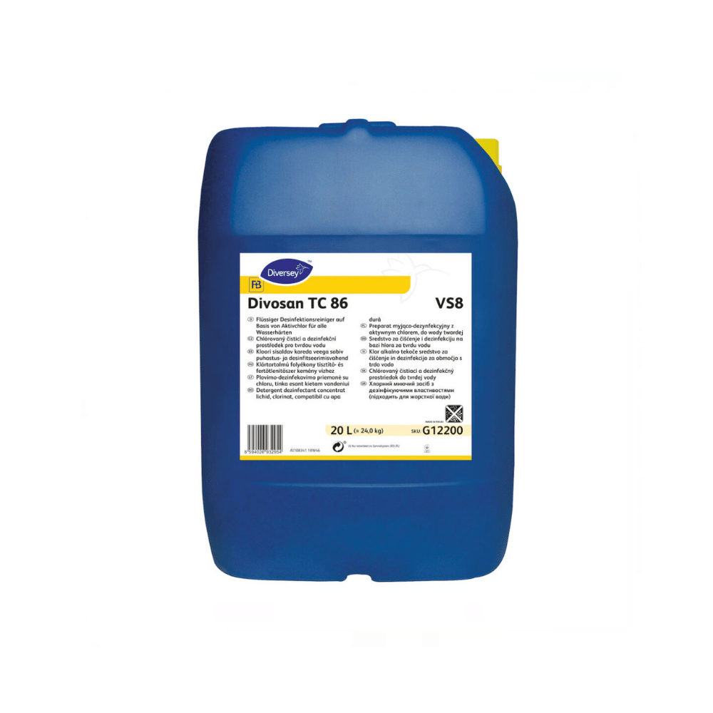 Divosan TC 86 20L egy alacsony habzású, klórozott, lúgos detergens-fertőtlenítőszer, amelyet CIP tisztításra és permetezésre használnak az élelmiszer-, ital- és tejiparban.