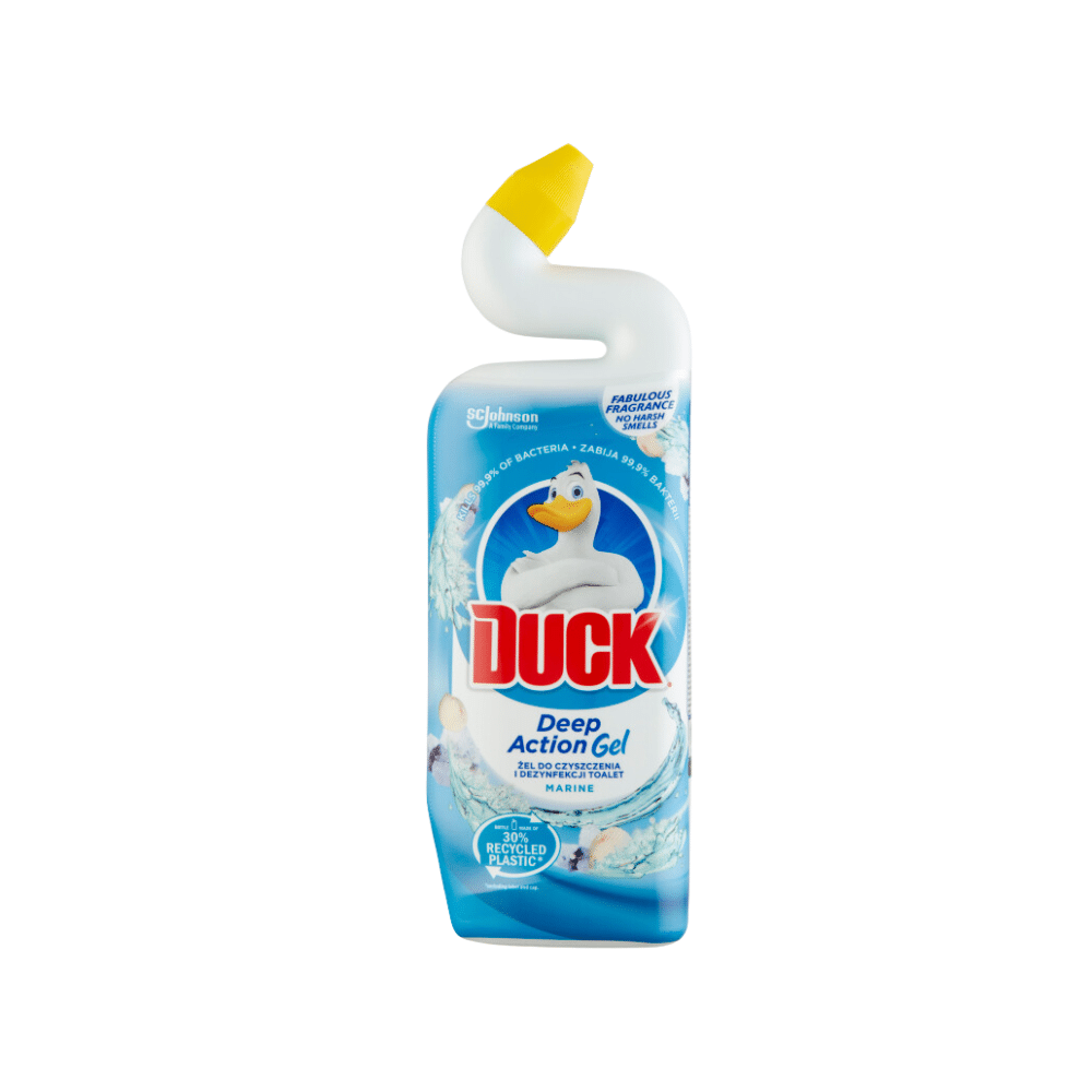 A Duck Deep Action Gel WC-tisztító fertőtlenítő gél Marine illattal 750ml hatékony megoldást kínál a toalett alapos tisztítására és fertőtlenítésére. Különleges, ívelt nyakú kialakítása lehetővé teszi, hogy a nehezen elérhető perem alatti részeket is könnyedén megtisztítsa. Az erőteljes gél formula segít eltávolítani a vízkövet, a szennyeződéseket és a kellemetlen szagokat, miközben hosszan tartó, friss tengerillattal tölti meg a fürdőszobát.
