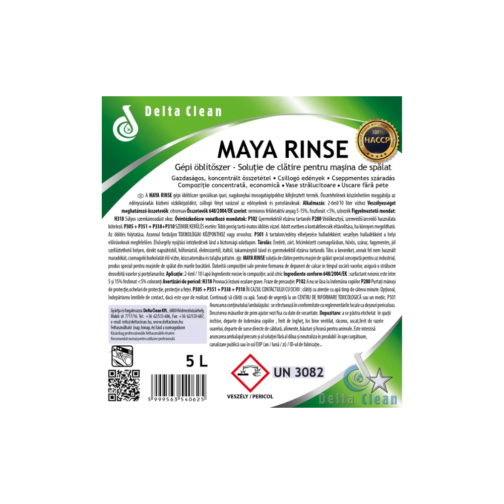 A Maya Rinse gépi öblítőszer 5L egy professzionális öblítőszer, amely segít megelőzni a vízkőfoltok és lerakódások kialakulását, így az edények, poharak és porcelánok kristálytiszták és csillogóak maradnak.