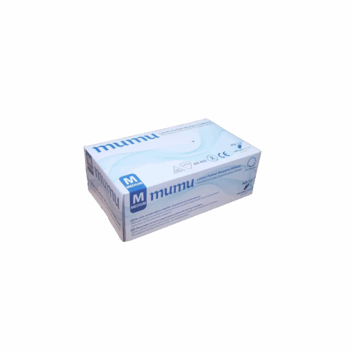 Termékleírás / MUMU egyszerhasználatos latex fehér gumikesztyű M-es 100 db/doboz