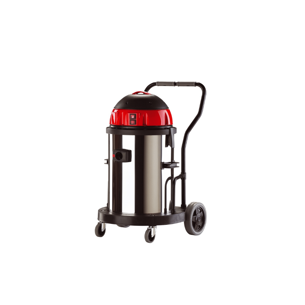 Kocsira szerelt hárommotoros száraz-nedves ipari kivitelű porszívó 62L-es tartállyal.