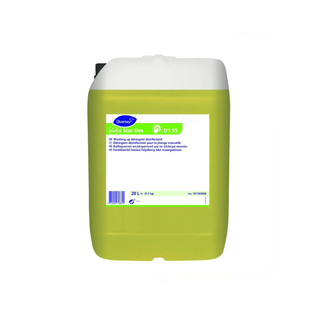 | Legfontosabb tulajdonságok | A Suma Star Des Fertőtlenítő kézi mosogatószer D1.55 20L fertőtlenítő tisztítószer koncentrátum, mely bármilyen felületet egy lépésben tisztít és fertőtlenít. A termék minden edény és eszköz fertőtlenítő hatású kézi mosogatására alkalmas, valamint alkalmazható élelmiszertároló helyiségekben történő felülettisztításra is. |